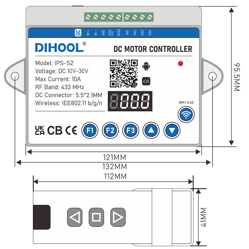 IPS-S2 motor controller that integrates infrared/radio frequency/WIFI/ button control, mainly used to control electric linear actuators. The controller is compatible with voltage of DC10V~30V, maximum current of 10 A. The positive and negative poles need to be wired according to the wiring diagram. If the positive and negative connections are not correct, it will not burn the controller. For example, 60W Iinear actuator, please choose 60-90W power adapter/switch power supply. If use smaller power, the motor will not working. The controller can be used to control various specifications of electric linear actuators. WIFI module can be controlled through the "eWelink" APP, and only supports 2.4G WIFI. There are 6 buttons F1, F2, F3, ▲, ▼,