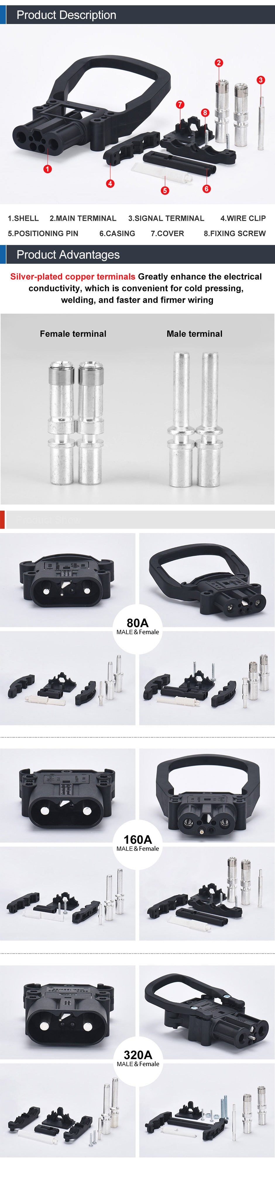 INTRODUCTION Current Rating (Amperes): 80A/160A/320A Voltage Ratings (Volts): 150V Terminal material: Silver-plated copper Insulation material: PP Protection level: IP23 Flame retardant rating: UL94V-0 Interface type: AC/DC Operating Temperature: -20°C-105°C Accessories: One plug comes with two main terminals and one signal terminal Features: The connector is separated from male and female, and the female connector has a handle. Use range: Be used for electric...