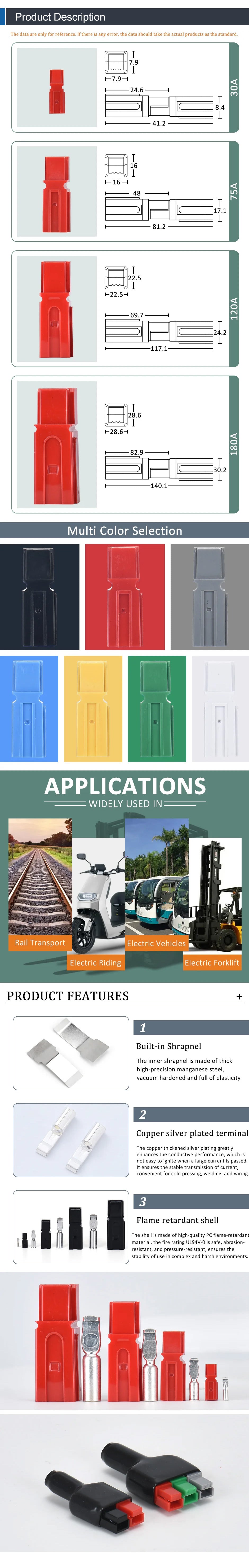INTRODUCTION Rated current: 45A/75A/120A/180A Color: White/Black/Red/Green/Yellow/Blue/Grey Wire Diameter : Various American Standard Wire Diameters Interface type: AC or DC Rated voltage: 600V Working Temperature:-25℃-105 ℃ Shell material: PC UL94V0 Terminals material: Silver-plated Copper Shrapnel material: 65Mn Steel Package: 1 piece connector contains 1 plastic shell and 1 silver-plated copper terminals TECHNICAL PARAMETERS Model Rated current (A) Terminal inner diameter(mm) Match...