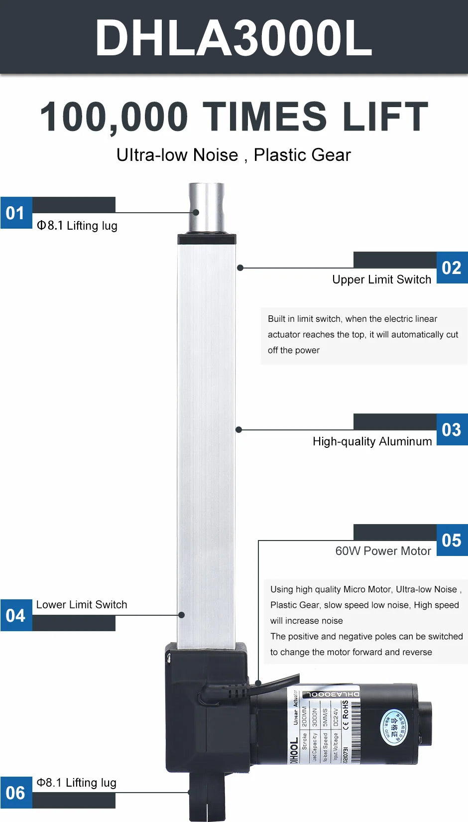Note: The stroke can be customized such as 650MM, 70MM, etc., And it will take 3-7 days. TECHNICAL PARAMETERS Voltage DC24~32V No-Load Speed (MM/S) 5 10 13 15 20 30 40 52 66 88 Load Pull Capacity (N) 3000 1500 1200 1000 800 600 400 300 250 150 Load Push...