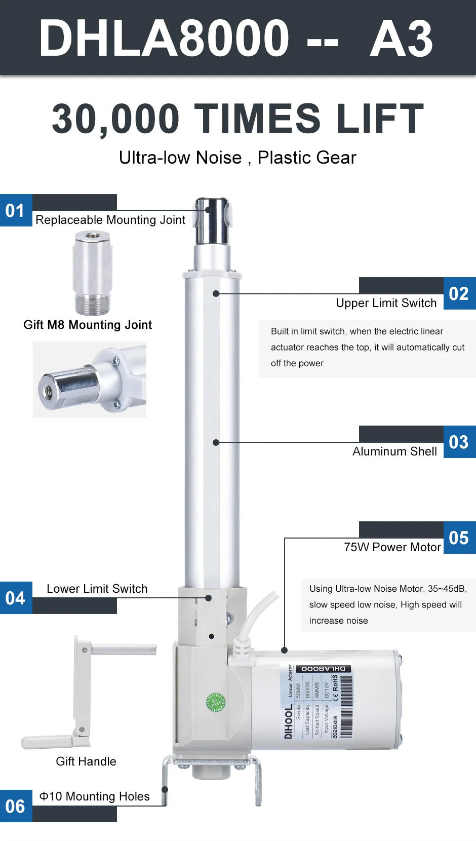 Electric Linear Motion Actuator 24V DC Motor 8000N 1760LB Load - DHLA8000-A3