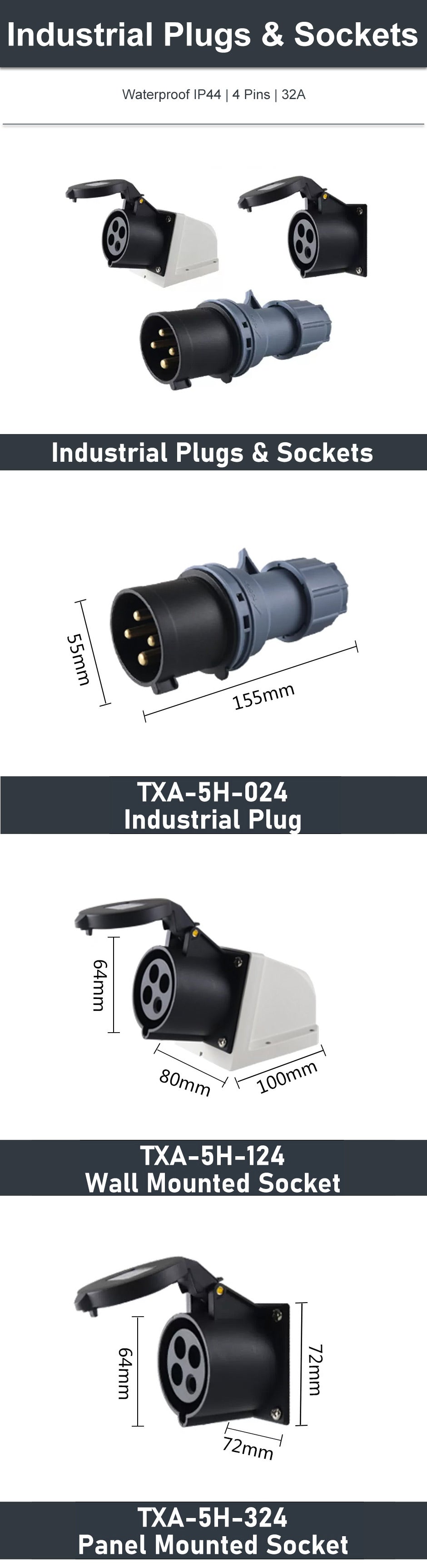 TXA-5H Black Industrial Plug And Socket Coupler Waterproof IP44 4Pins 32A 690V