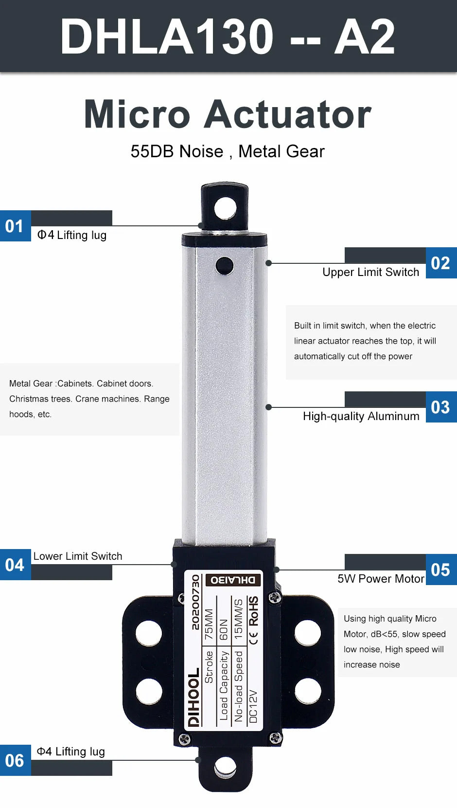 Electric Linear Motion Actuator 12V DC Motor 180N 40LB Load - DHLA130-A2