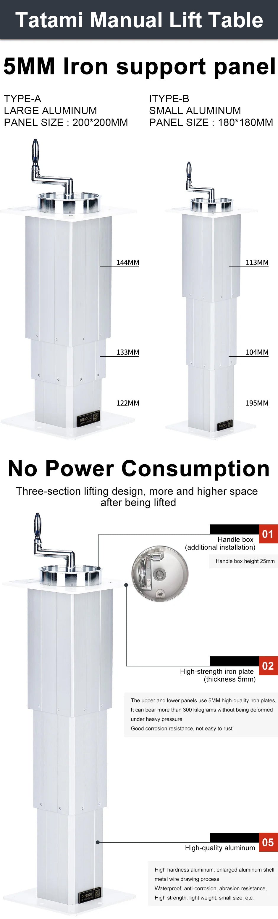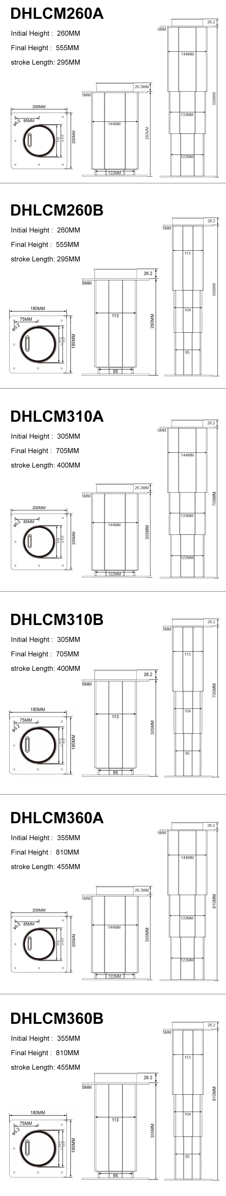 TECHNICAL PARAMETERS Model DHLCM260A DHLCM310A DHLCM360A Panel Size 200*200 200*200 200*200 Model DHLCM260B DHLCM310B DHLCM360B Panel Size 180*180 180*180 180*180 Initial Height H (MM) 260 305 355 Final Height FH (MM) 555 705 810 Stroke Length S (MM) 295 400 455 Section 3 3 3 Speed 5MM/Circle Bearing Capacity 200KG...