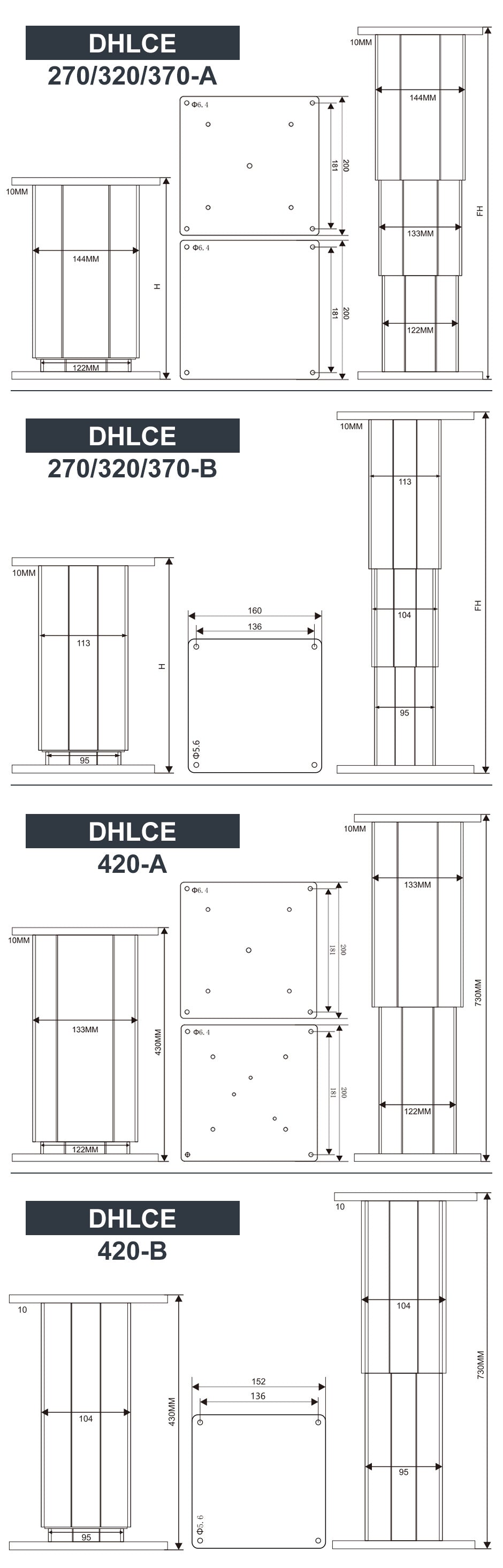 TECHNICAL PARAMETERS Model DHLCE270A DHLCE320A DHLCE370A DHLCE420A Panel Size 200*200 200*200 200*200 200*200 Model DHLCE270B DHLCE320B DHLCE370B DHLCE420B Panel Size 160*160 160*160 160*160 152*152 Initial Height H (MM) 275 325 375 430 Final Height FH (MM) 545 695 800 730 Stroke Length S (MM) 270 370 425 300 Section 3...